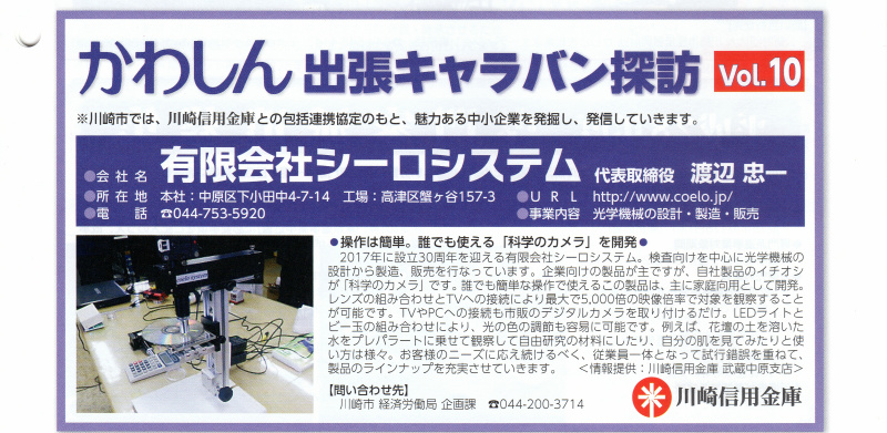 「 公益財団法人 川崎市産業振興財団 」様発行の産業情報かわさき 2016年04月号の かわしん出張キャラバン探訪vol10に掲載されました。 ![]() ↑クリックすると拡大表示されます。 |