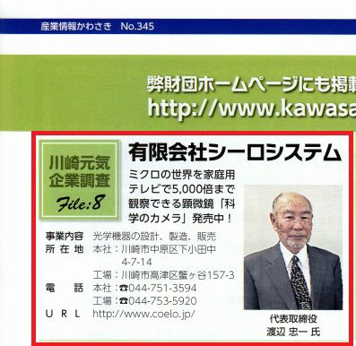 「 公益財団法人 川崎市産業振興財団 」様発行の産業情報かわさき 2017年05月号の 平成28年度川崎元気企業調査報告に掲載されました。 ![]() ↑クリックすると拡大表示されます。 |